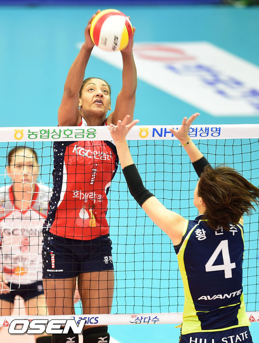 22일 오후 경기도 수원실내체육관서 열린 NH농협 2014~2015 V-리그 여자부 현대건설과 인삼공사의 경기, 2세트 인삼공사 조이스가 연타를 날리고 있다.