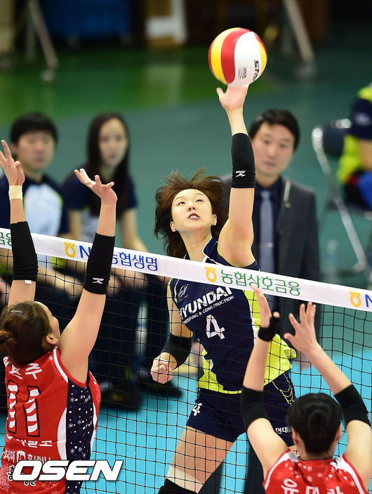 22일 오후 경기도 수원실내체육관서 열린 NH농협 2014~2015 V-리그 여자부 현대건설과 인삼공사의 경기, 1세트 현대건설 황연주가 강타를 날리고 있다.