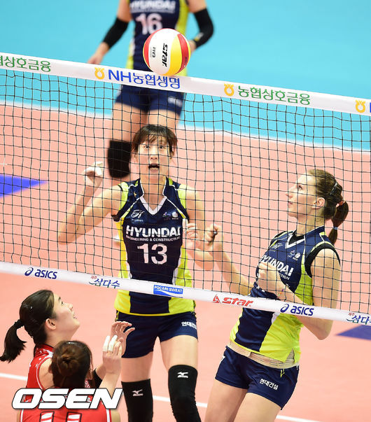 22일 오후 경기도 수원실내체육관서 열린 NH농협 2014~2015 V-리그 여자부 현대건설과 인삼공사의 경기, 1세트 양팀 선수들이 네트에 걸린 배구공을 바라보고 있다.