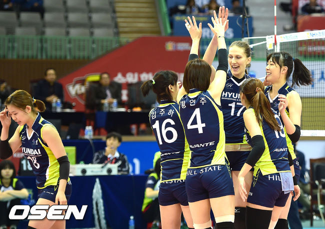 현대건설은 22일 수원 실내체육관에서 열린 NH농협 2014~2015 V-리그 3라운드 KGC인삼공사와의 경기에서 3-0(25-13, 25-22. 25-10)으로 가볍게 승리했다. 10승 4패, 승점 27점이 된 현대건설은 한국도로공사(승점 26점)를 제치고 선두에 복귀했다.