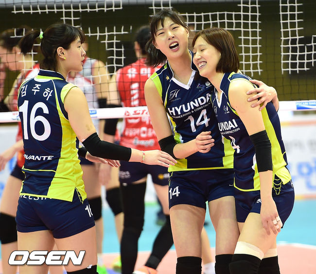 현대건설은 22일 수원 실내체육관에서 열린 NH농협 2014~2015 V-리그 3라운드 KGC인삼공사와의 경기에서 3-0(25-13, 25-22. 25-10)으로 가볍게 승리했다. 10승 4패, 승점 27점이 된 현대건설은 한국도로공사(승점 26점)를 제치고 선두에 복귀했다.