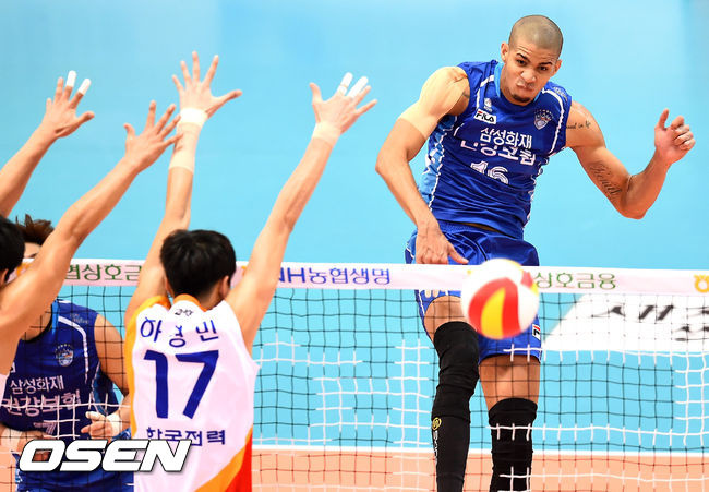 22일 오후 경기도 수원실내체육관서 열린 NH농협 2014~2015 V-리그 남자부 한국전력과 삼성화재의 경기, 1세트 삼성화재 레오가 강타를 날리고 있다.