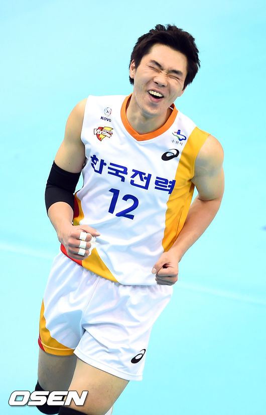 22일 오후 경기도 수원실내체육관서 열린 NH농협 2014~2015 V-리그 남자부 한국전력과 삼성화재의 경기, 1세트 한국전력 전광인이 블로킹 성공후 환호하고 있다.