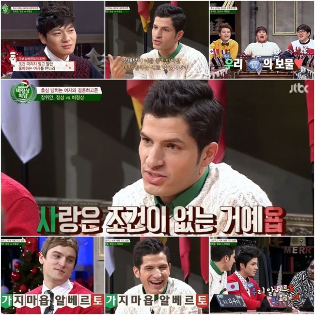 사랑꾼 알베르토는 “사랑에는 조건이 없다”고 말문을 연 후, 조건을 따지지 말고 일단 좋아하는 여자를 만나라고 조언해 모두를 감탄케 했다. 일단 조건을 따지지 말고 좋아하는 여자부터 만나라는 의미였다. 이에 성시경도 “일단 좋아하는 여자를 만나야지. 발 잘 닦는 여자 중에 좋아하는 여자를 고르는 건 쉽지 않다”고 알베르토 의견에 공감을 표했다.