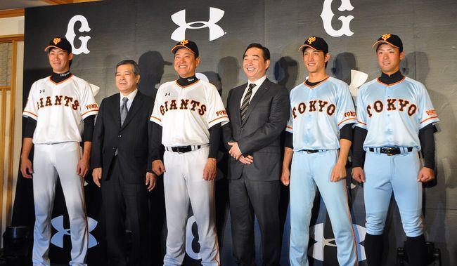 지난 22일 언더아머와 요미우리 자이언츠의 파트너십 계약 체결식에서 언더아머 야스다 슈이치 대표와 요미우리 자이언츠 구보 히로시 대표가 하라 다츠노리 감독 및 선수들과 함께 2015년부터 사용될 새로운 유니폼을 선보이고 있다. 왼쪽부터 고야마 유우키, 구보 히로시 자이언츠 대표, 하라 다쓰노리 자이언츠 감독, 야스다 슈이치 일본 언더아머 대표, 고바야시 세이지, 후지무라 다이스케.