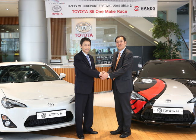 한국토요타자동차(사장 요시다 아키히사)와 자동차 휠 전문 제조업체 핸즈 코퍼레이션(사장 이석주)은 22일 토요타 용산 전시장에서 토요타 86 원메이크 레이스 후원을 내용으로 하는 '핸즈 모터스포츠 페스티벌 2015 파트너십'을 체결했다고 발표했다.