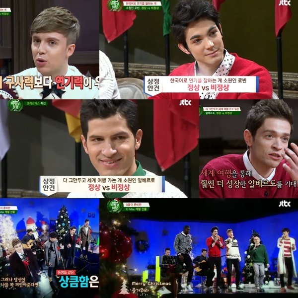 지난 22일 방송된 JTBC ‘비정상회담’에서는 크리스마스를 맞아 샘 오취리, 기욤 패트리, 장위안, 줄리안 퀀타르트, 알베르토 몬디, 테라다 타쿠야, 타일러 라쉬, 로빈 데이아나, 다니엘 린덴만 등 G9이 세계의 크리스마스에 대해 이야기를 나누고 크리스마스 캐럴 무대를 꾸미는 등 연말 분위기를 한껏 연출했다.