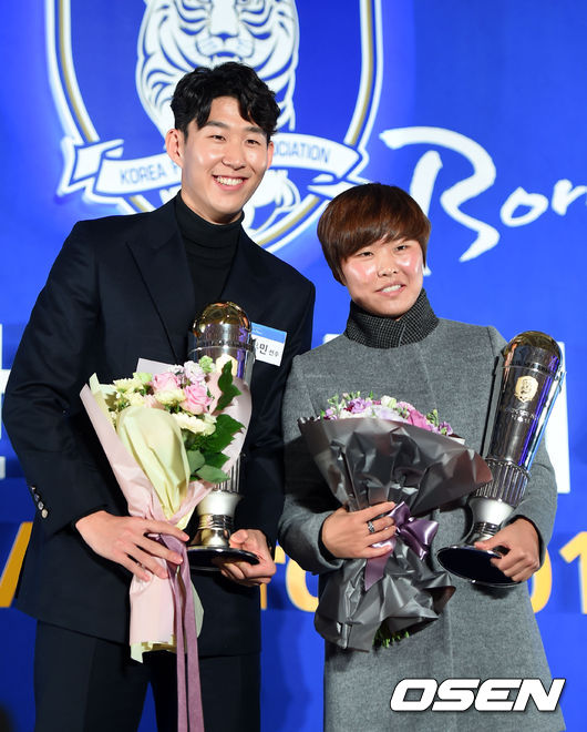 올해의선수상을 수상한 레버쿠젠 손흥민과 첼시레이디스 지소연이 기념촬영을 하고 있다.