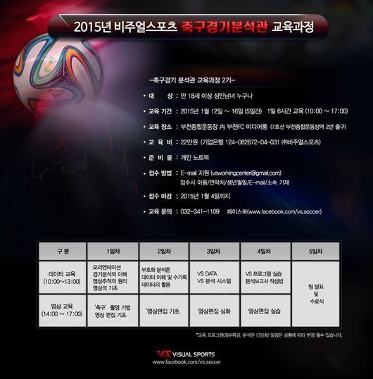 스포츠 영상분석 전문회사인 비주얼스포츠는 내년 1월 12일부터 16일까지(5일간) 부천FC1995 프로축구단 미디어실에서 ‘2015 비주얼스포츠 축구경기분석관 교육’을 실시한다.