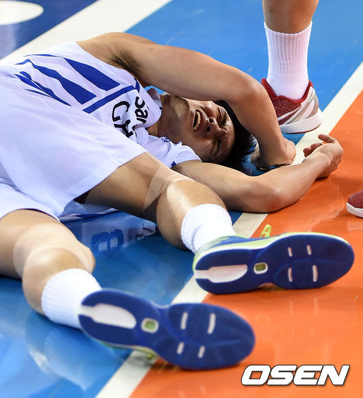2쿼터 삼성 슛동작 중 넘어진 삼성 차재영이 고통스러워하고 있다.