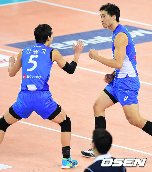 1세트, 우리카드 김정환이 공격을 성공 시킨 뒤 환호하고 있다.