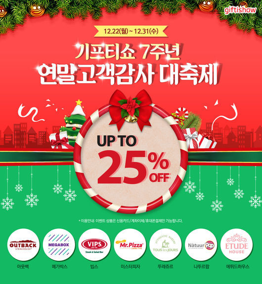 이벤트 상품으로는 VIPS, 아웃백스테이크하우스 등 외식 상품부터 메가박스, 미스터피자, 뚜레쥬르, 나뚜루 등 영화, 베이커리류까지 연말 선물로 준비하기에 부담 없는 7개사 인기 브랜드 70개 상품을 최대 25%까지 할인하여 판매한다.
