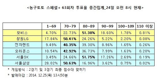 2경기 전자랜드-오리온스전의 경우 전자랜드(40.35%)와 오리온스(42.92%)가 모두 70~79점대를 기록할 것이라는 전망이 다수를 차지했다.