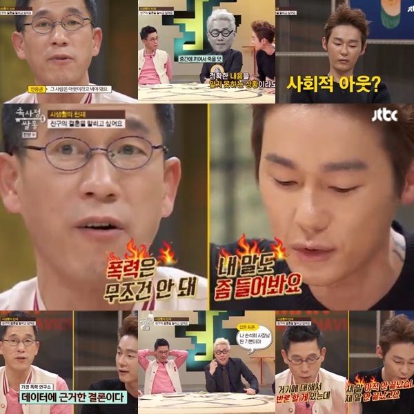 허지웅은 ‘배제’란 표현에 불편한 기색을 내비치며 “아무리 그 사람이 폭력을 했다고 해도 민주주의 사회에서 배제를 한다는 발언 자체가 위험한 것 아니냐”고 반박했고 진중권은 “여자에게 폭행을 한다는 것 자체가 용납할 수 없다”며 한 조사결과를 언급하면서 “반드시 반복될 것”이라고 한 마디 했다.