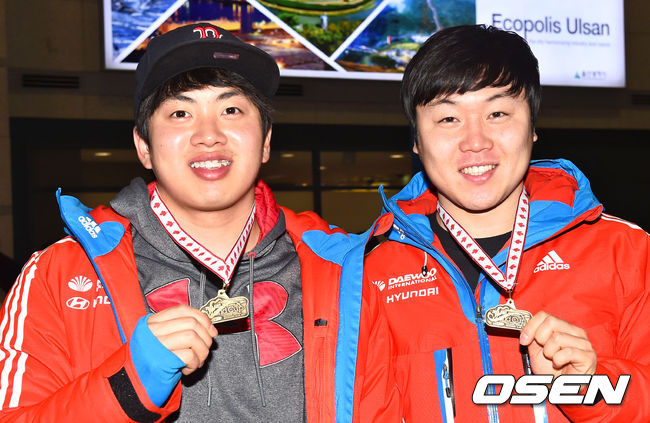 봅슬레이 원윤종과 서영우가 포즈를 취하고 있다.