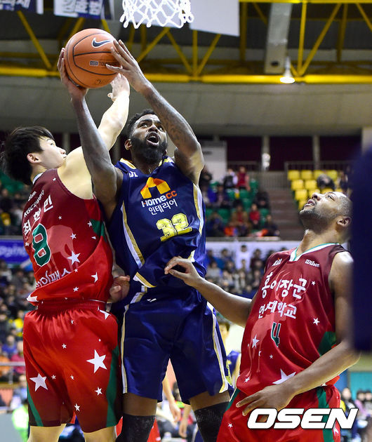 2쿼터, KCC 윌커슨이 KGC 최현민과 윌리암스의 수비를 피해 슛을 시도하고 있다.