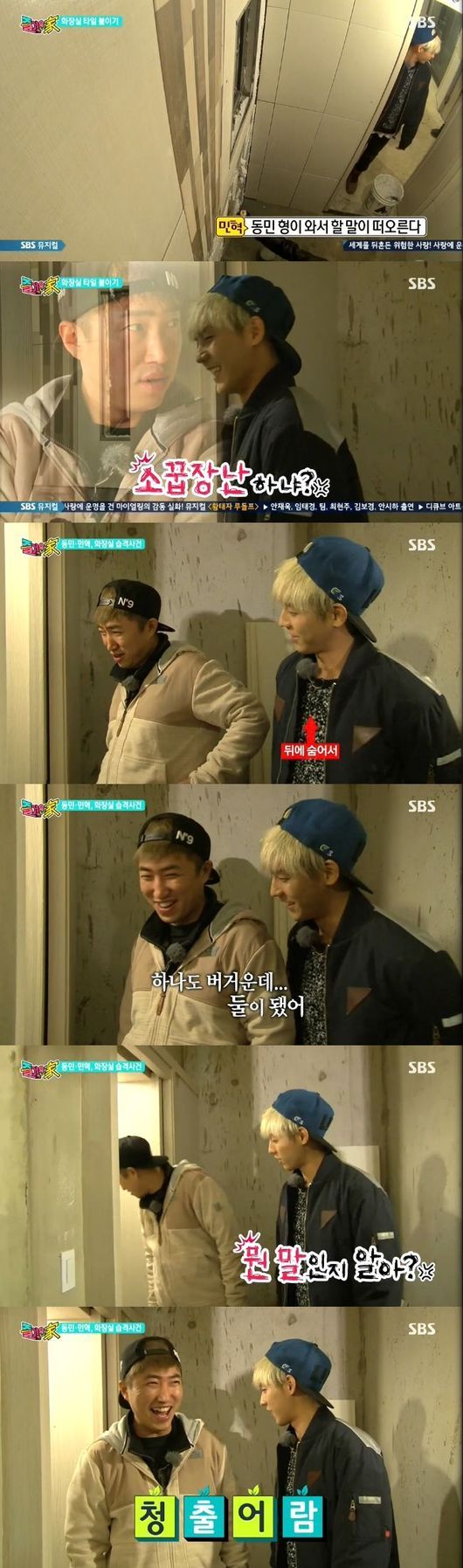 민혁은 24일 오후 방송된 SBS 예능프로그램 '즐거운 가-에코빌리지'(이하 '즐거운가')에서 화장실에 타일을 붙이고 있던 송창의-민아에게 다가와 "뭐하는 거냐? 여기는 따뜻하고 좋다"고 부러움을 드러냈다.