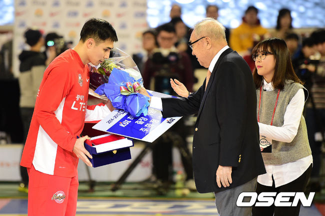 경기에 앞서 KBL 김영기 총재가 900경기 출장 기록을 세운 SK 주희정에 꽃다발을 건네고 있다.
