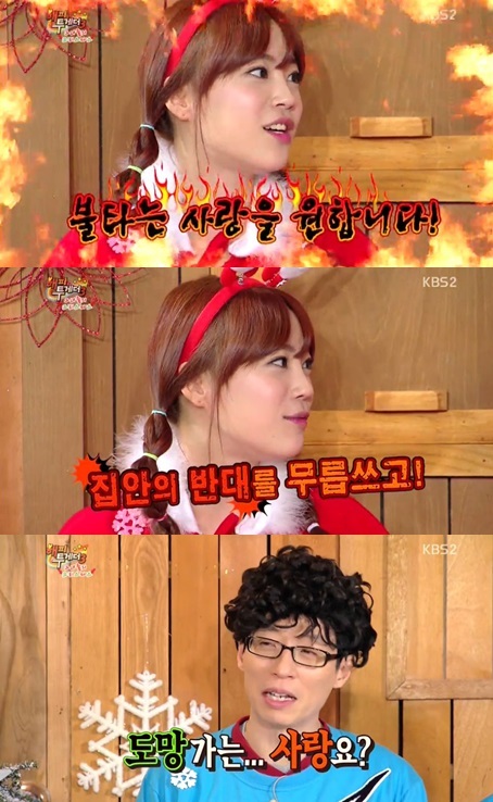 허영지는 25일 오후 방송된 KBS 2TV '해피투게더 시즌3(이하 '해투3')'에서 "집안이 반대하는 불같은 사랑을 해보고 싶다"고 밝혔다.