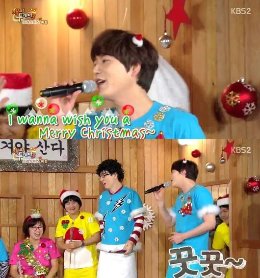 25일 방송된 KBS '해피투게더3'에 규현이 깜짝 등장했다. 캐롤을 부르며 등장한 규현은 출연진들의 환영을 받았다.