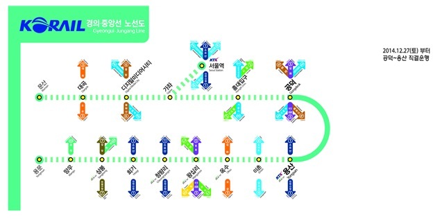코레일이 오는 27일부터 경의선 3단계 용산-공덕 구간의 개통에 따라 경의선과 중앙선 간의 직결운행을 시작한다고 밝혔다.