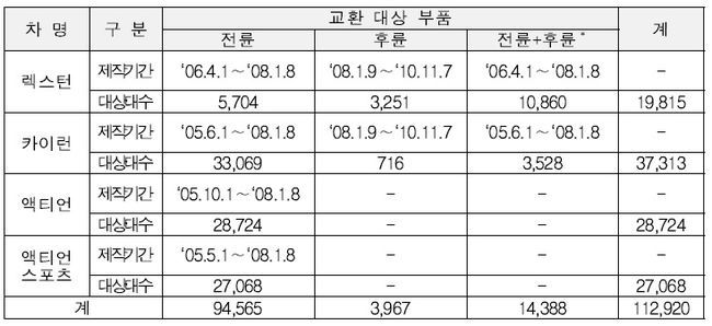 리콜대상은 2005년 6월 1일부터 2010년 11월 17일 사이에 제작된 '렉스턴' '카이런' '액티언' '액티언스포츠' 등 4개 차종 총 11만 2920대이다.