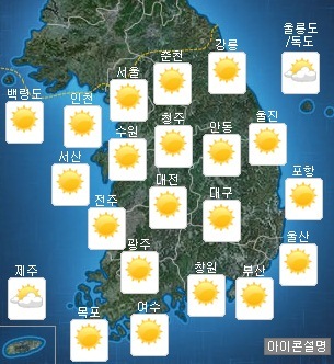 26일 기상청에 의하면 중국 산둥반도 부근에 위치한 고기압의 영향을 받아 전국이 대체로 맑겠다.