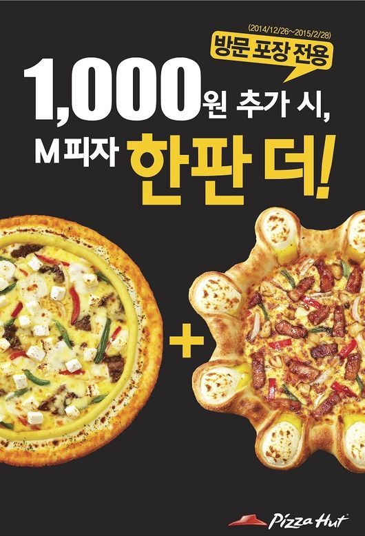 피자헛은 이번 이벤트를 통해 프리미엄 피자 미디엄 사이즈를 방문포장으로 구매하는 소비자에게 동일 사이즈 피자를 1000원에 한판 더 제공한다. 해당되는 프리미엄 피자는 리치골드, 치즈크러스트, 크라운포켓, 스타엣지 총 4종으로 추가하는 피자 역시 4종 중 선택 가능하다.