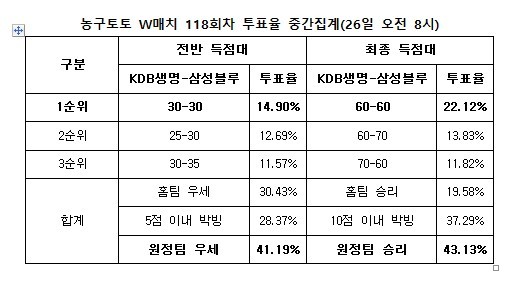 최종 KDB생명 60점대-삼성블루 60점대 22.12%로 최다 집계…27일(토) 오후 6시 50분 마감