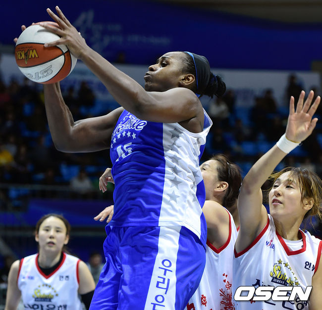 26일 오후 인천 도원체육관에서 열린 '2014-2015 KB국민은행 여자프로농구' 신한은행과 우리은행의 경기, 4쿼터 우리은행 굿렛이 리바운드에 성공하고 있다.