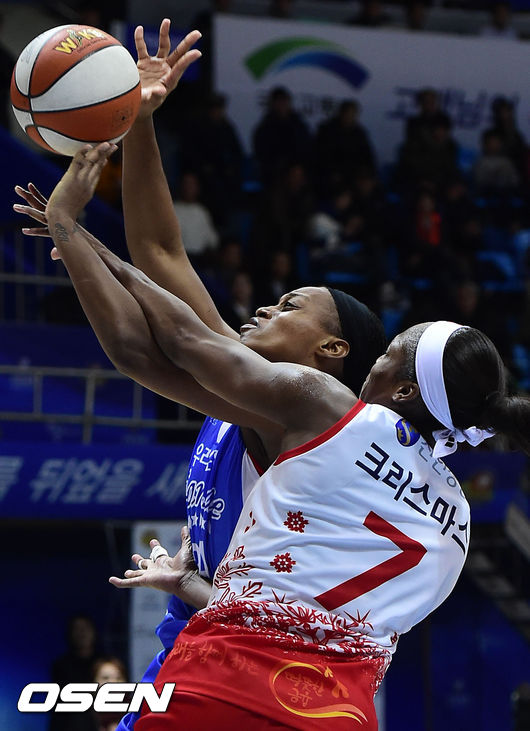 26일 오후 인천 도원체육관에서 열린 '2014-2015 KB국민은행 여자프로농구' 신한은행과 우리은행의 경기, 4쿼터 우리은행 휴스턴의 슛시도를 신한은행 크리스마스가 수비하고 있다.