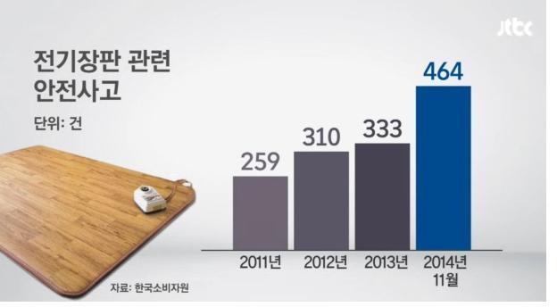 2011년 이후 한국소비자원 소비자위해감시시스템(CISS)에 접수된 전기장판류 안전사고는 2011년 259건, 2012년 310건, 2013년 333건, 2014년 11월말 현재 464건 등 총 1366건으로 매년 증가하고 있는 것으로 나타났다.
