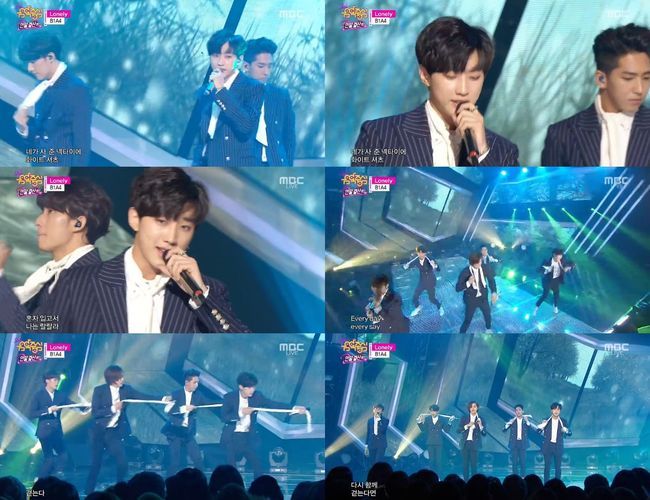 오랜만에 음악방송에 출연한 B1A4가 '론리'를 불러 감성으로 무대를 채웠다.