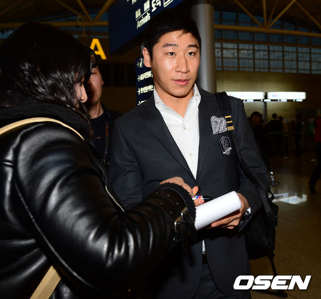27일 오후 55년 만의 아시아 정상 탈환에 도전하는 축구 대표팀이 다음 달 아시안컵이 열리는 호주로 출국했다. 출국 전 이근호가 팬에게 사인을 해주고 있다.