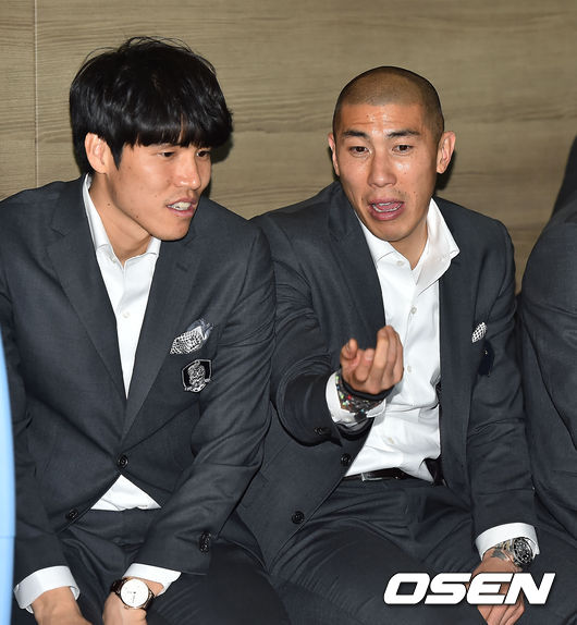 27일 오후 55년 만의 아시아 정상 탈환에 도전하는 축구 대표팀이 다음 달 아시안컵이 열리는 호주로 출국했다. 출국 전 차두리와 김창수가 얘기를 나누고 있다.