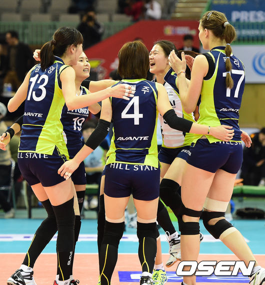 경기후 현대건설 선수들이 승리를 기뻐하고 있다./jpnews@osen.co.kr