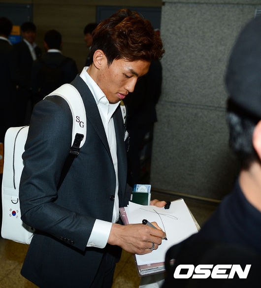 27일 오후 55년 만의 아시아 정상 탈환에 도전하는 축구 대표팀이 다음 달 아시안컵이 열리는 호주로 출국했다. 출국 전 김승규가 팬들에게 사인을 해주고 있다.
