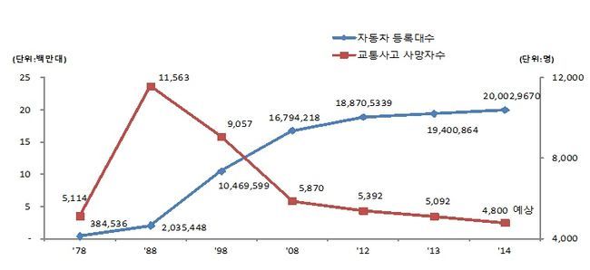 도로교통사고 사망자 수 4,800명은 포니자동차 등 개인 승용차가 대중화되기 시작한 1978년도(5,114명) 이후 가장 낮은 수준이다. 2014년 10월 기준 자동차 등록대수가 2,000만대가 넘는 등 교통 환경이 급격히 변화하고 있는 점을 고려할 때, 도로교통사고 사망자 수가 4,800명 수준으로 감소하는 것은 매우 의미있는 성과로 평가 된다.