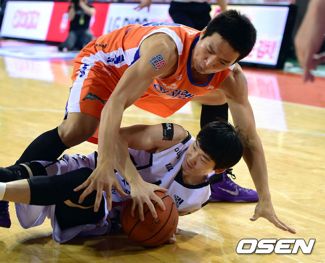 2쿼터 전자랜드 이현호와 kt 김현수가 루즈볼 다툼을 벌이고 있다.