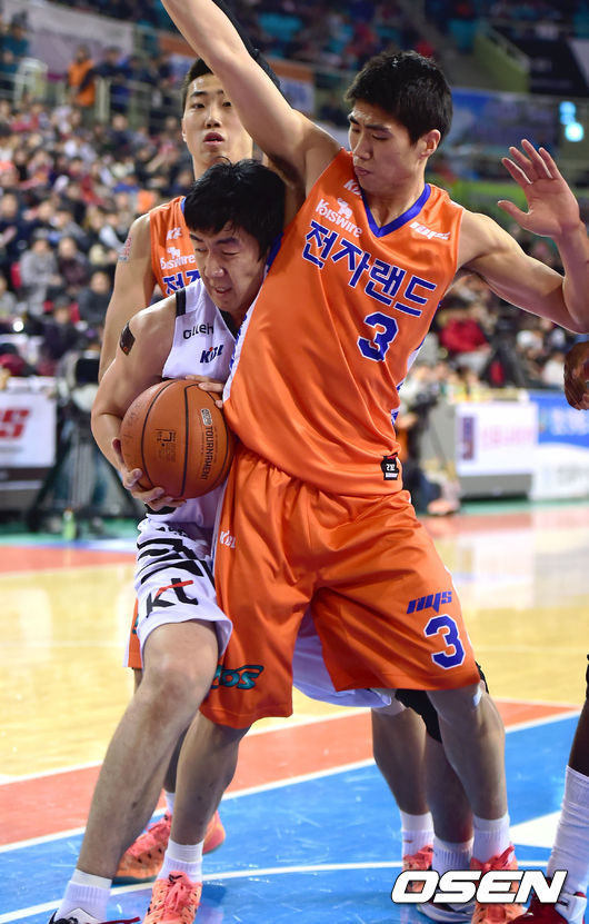 3커터 kt 박철호가 전자랜드 김지완에 수비에 고전하고 있다.