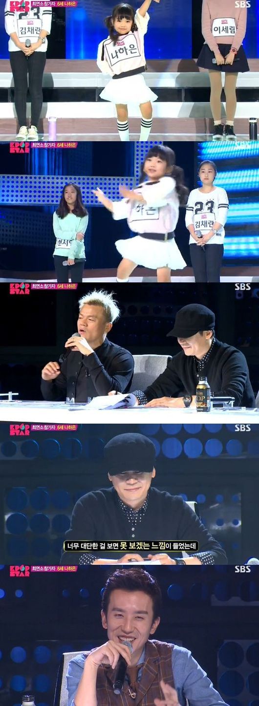 심사위원들은 28일 오후 방송된 SBS 예능프로그램 '일요일이 좋다-K팝스타4'에서 최연소인 6세의 참가자 나하은의 춤과 노래에 흐뭇한 미소를 감추지 못했다.