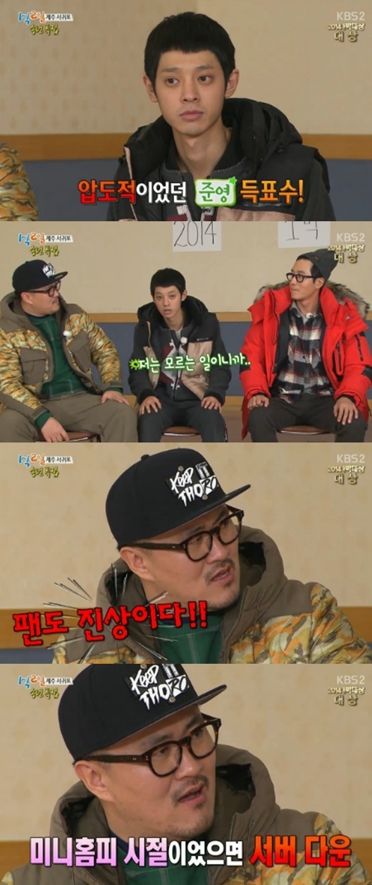 28일 방송된 KBS 2TV 예능프로그램 ‘해피선데이-1박2일’에서는 제주 서귀포로 송년특집 여행을 떠난 멤버들(김주혁 김준호 차태현 데프콘 김종민 정준영)의 모습이 그려졌다.