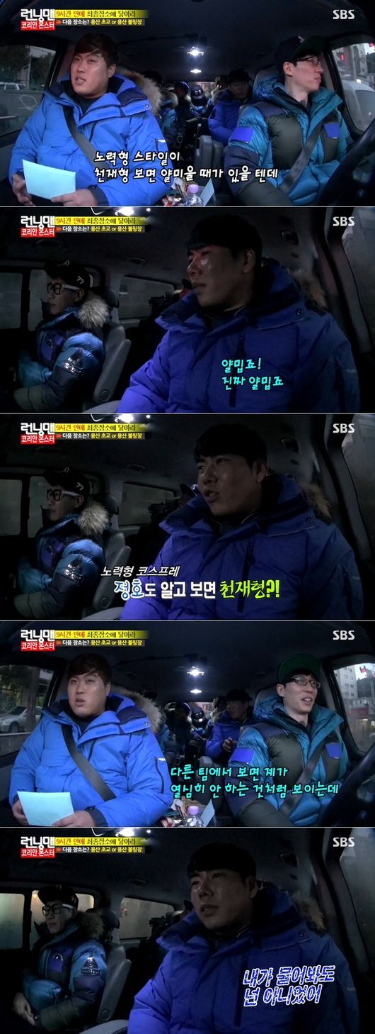강정호는 28일 오후 방송된 SBS 예능프로그램 ‘일요일이 좋다-런닝맨’(이하 ‘런닝맨’)에서 “노력형 스타일이 천재형 스타일 보면 얄밉지 않냐”는 질문을 받았다. 이에 강정호는 “얄밉다. 진짜 얄밉다”고 답했다.