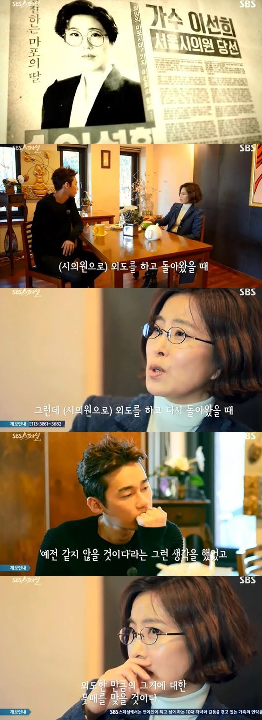 이에 이선희는 “그 전에는 어떤 홀에서 하든 가득가득 관객이 찼다. 관객을 걱정하고 노래를 부른 적은 없었다. 그런데 (시의원으로) 외도를 하고 돌아왔을 때 예전같지 않을 것이란 생각을 했다”면서 “외도한 만큼의 뭇매를 맞을 것이니 담담하게 이겨내야지 생각했다”고 말했다.