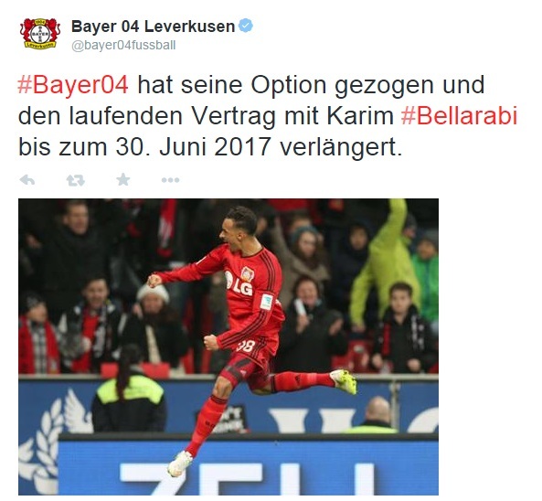 레버쿠젠은 지난 28일(이하 한국시간) 공식 트위터를 통해 벨라라비와 2017년 6월 30일까지 계약을 연장했다고 밝혔다. 레버쿠젠과 벨라라비의 종전 계약은 2015년 여름까지였다.