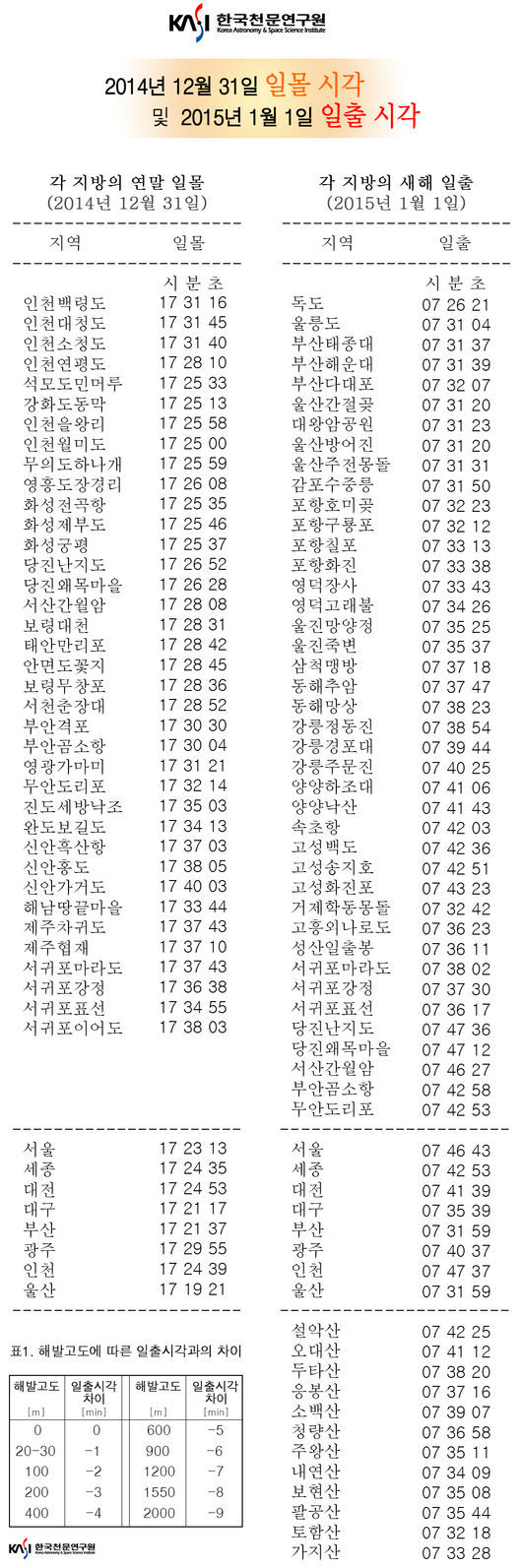 지난 23일 한국천문연구원은 주요지역의 2014년 12월 31일 일몰시각 및 2015년 1월 1일의 일출 시각을 발표했다.