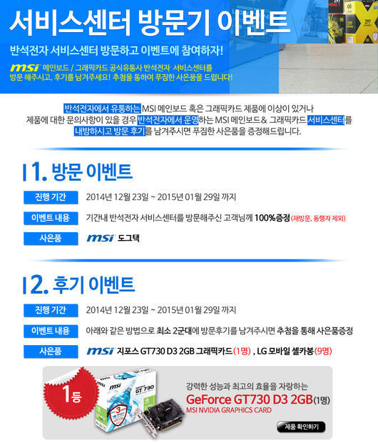 2014년 12월 23일부터 2015년 01월 29일 약 한달간 진행하는 이번 행사는 반석전자의 MSI 고객지원 센터의 질높은 서비스를 알리기 위한 일환으로 행사 기간내 서비스센터를 방문하는 모든 고객(재방문, 동행자 제외)에게 MSI에서 마련한 기념품을 증정하며, A/S센터 방문기를 커뮤니티 사이트에 게시한 후 응모하면 추첨을 통해 지포스 GT730 그래픽카드와 LG 셀카봉을 증정하는 혜택을 받을 수 있다.