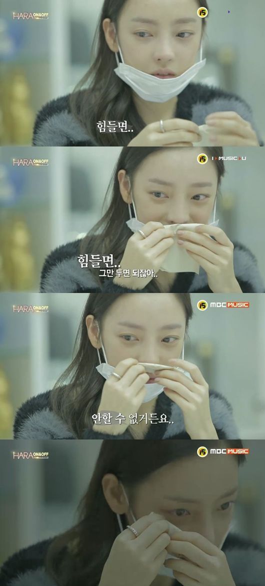 29일 오후 방송된 MBC뮤직 '하라 온앤오프(ON&OFF)'1회에서는 모든 내용에 앞서 구하라가 눈물을 흘리며 카메라 앞에서 자신의 마음을 털어놓는 장면으로 시작됐다.