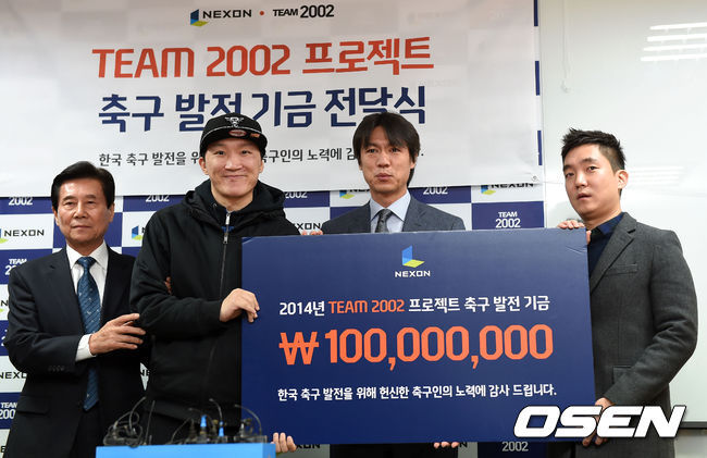 ㈜넥슨(대표 박지원)은 29일 자사가 서비스하는 온라인 축구게임 ‘EA SPORTS™ FIFA Online 3(이하 FIFA 온라인 3)’의 ‘2002 전설’ 프로젝트에 참여한 ‘TEAM 2002’ 멤버(홍명보 외 22인)들과 축구발전기금 총 1억 원을 선배 축구인과 경기 중 불의 사고로 투병 중인 선수들에게 기부했다.