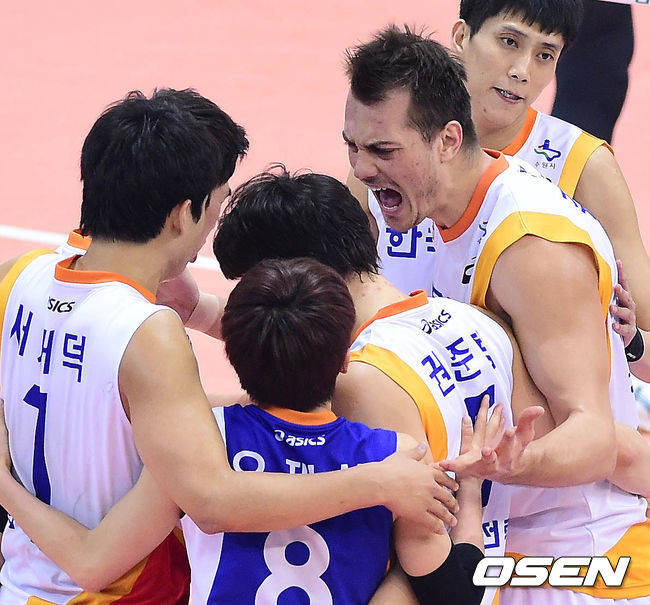 29일 오후 수원 실내체육관에서 열린 '2014-2015 NH농협 V-리그' 한국전력과 LIG 손해보험의 경기 1세트 한국전력 선수들이 득점 후 기뻐하고 있다.